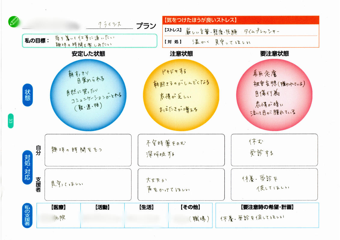 要注意状態になった時には「休養・受診を促してほしい」って書いたんだけど、そうなる前に出来れば自分からも相談してほしいなって言われて、今の職場の雰囲気だったら言えそうだな、って思って「はい!」と元気にお返事しました。