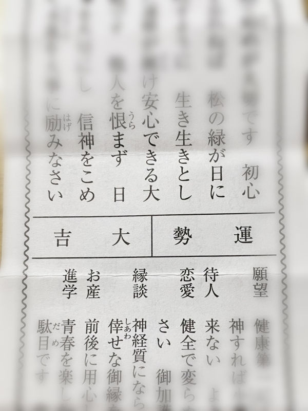 おみくじ引いたら大吉だったので結ばずに持って帰ってきたけど、結んだ方がよかったかもしれない。